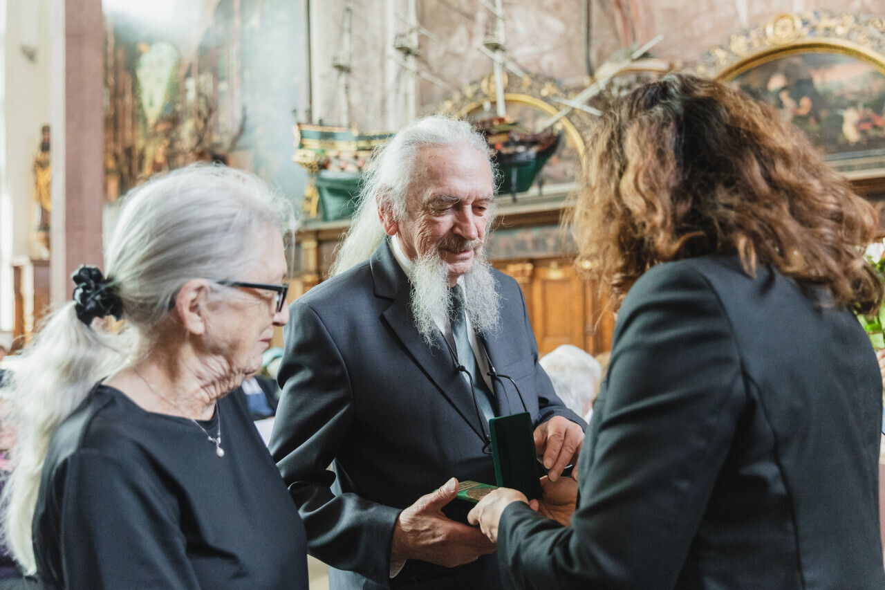 Gdańsk.Dwór Artusa. Jubileusz Par Małżeńskich - Złote Gody, podczas których Prezydent Gdańska Aleksandra Dulkiewicz wręczyła medale za długoletnie pożycie małżeńskie.