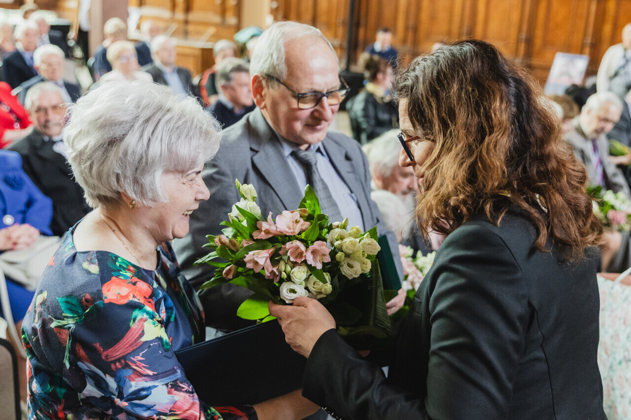 Gdańsk.Dwór Artusa. Jubileusz Par Małżeńskich - Złote Gody, podczas których Prezydent Gdańska Aleksandra Dulkiewicz wręczyła medale za długoletnie pożycie małżeńskie.