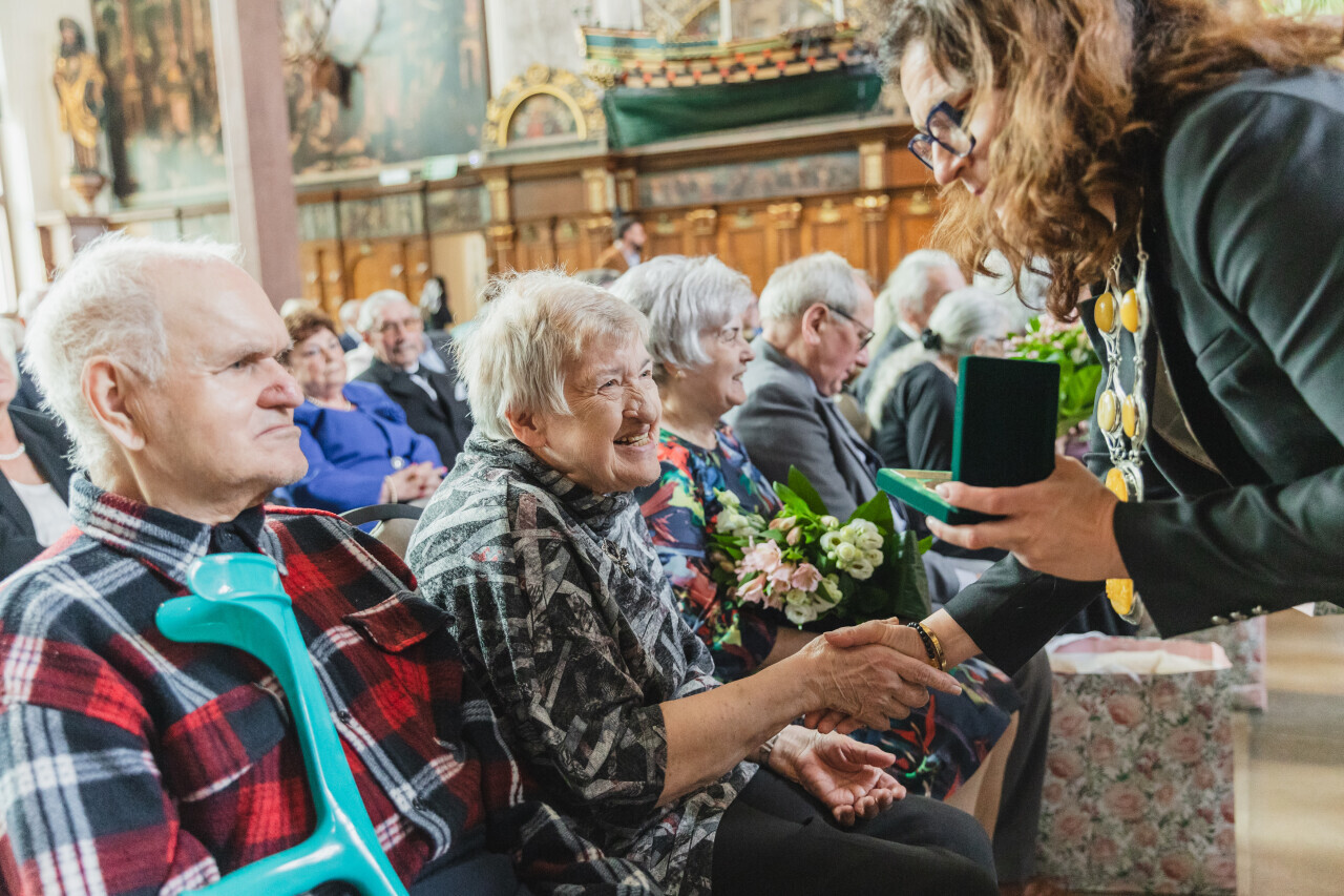 Gdańsk.Dwór Artusa. Jubileusz Par Małżeńskich - Złote Gody, podczas których Prezydent Gdańska Aleksandra Dulkiewicz wręczyła medale za długoletnie pożycie małżeńskie.