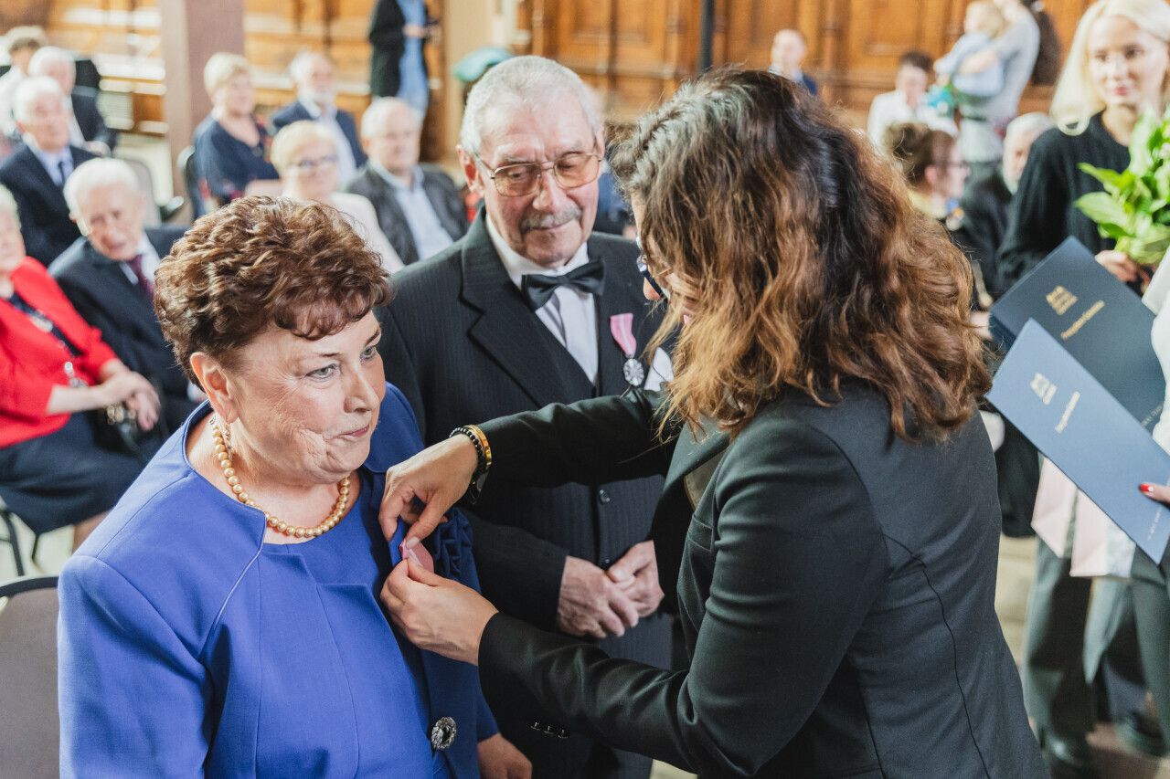 Gdańsk.Dwór Artusa. Jubileusz Par Małżeńskich - Złote Gody, podczas których Prezydent Gdańska Aleksandra Dulkiewicz wręczyła medale za długoletnie pożycie małżeńskie.