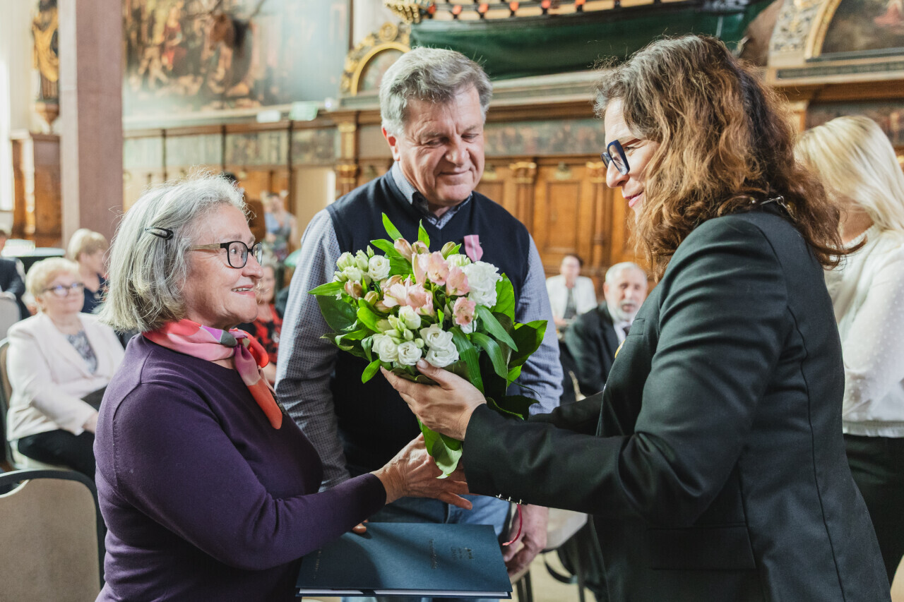 Gdańsk.Dwór Artusa. Jubileusz Par Małżeńskich - Złote Gody, podczas których Prezydent Gdańska Aleksandra Dulkiewicz wręczyła medale za długoletnie pożycie małżeńskie.