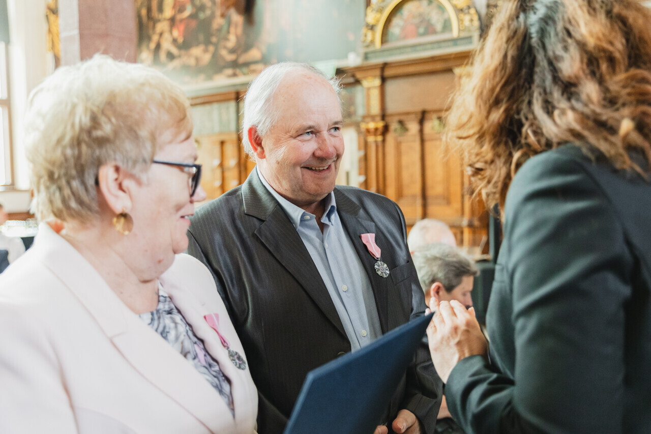 Gdańsk.Dwór Artusa. Jubileusz Par Małżeńskich - Złote Gody, podczas których Prezydent Gdańska Aleksandra Dulkiewicz wręczyła medale za długoletnie pożycie małżeńskie.