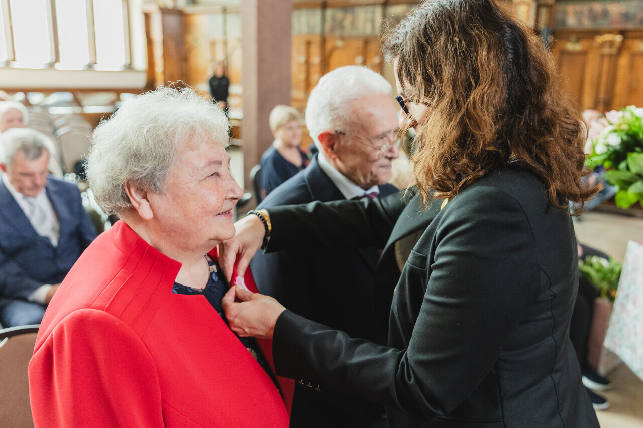 Gdańsk.Dwór Artusa. Jubileusz Par Małżeńskich - Złote Gody, podczas których Prezydent Gdańska Aleksandra Dulkiewicz wręczyła medale za długoletnie pożycie małżeńskie.
