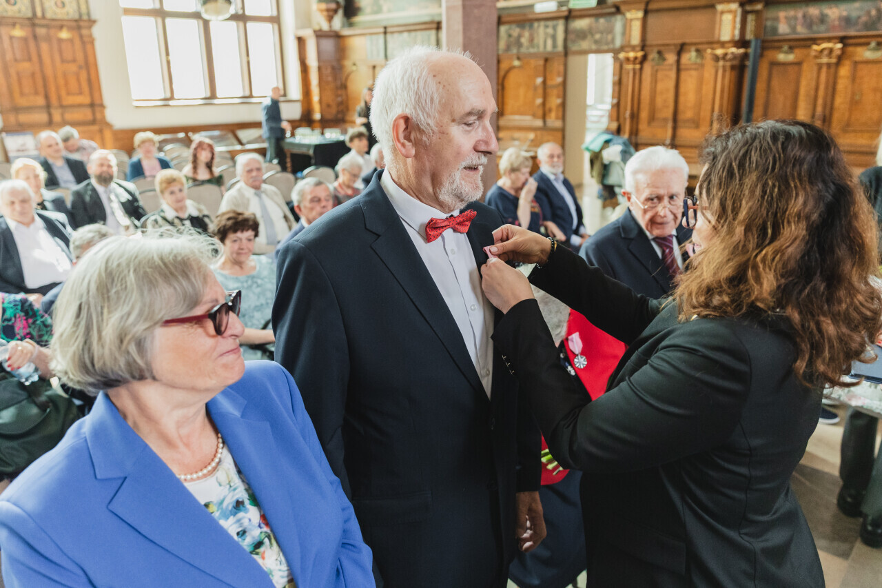 Gdańsk.Dwór Artusa. Jubileusz Par Małżeńskich - Złote Gody, podczas których Prezydent Gdańska Aleksandra Dulkiewicz wręczyła medale za długoletnie pożycie małżeńskie.