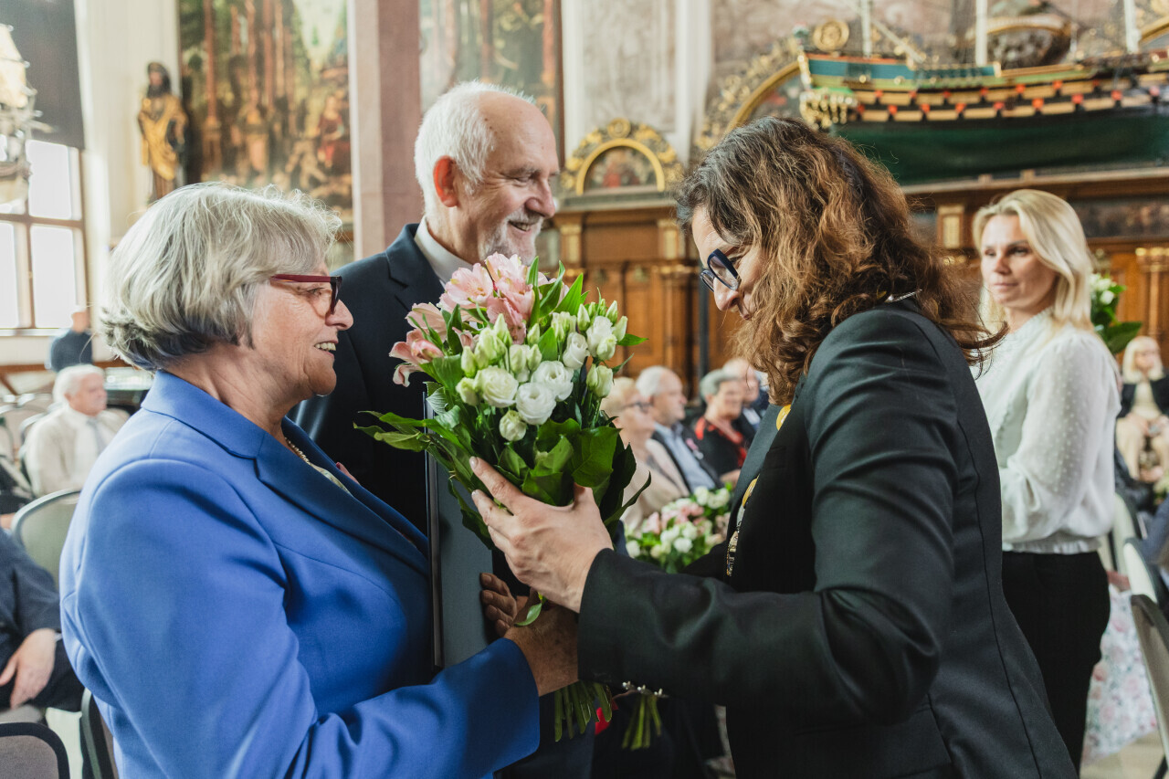 Gdańsk.Dwór Artusa. Jubileusz Par Małżeńskich - Złote Gody, podczas których Prezydent Gdańska Aleksandra Dulkiewicz wręczyła medale za długoletnie pożycie małżeńskie.