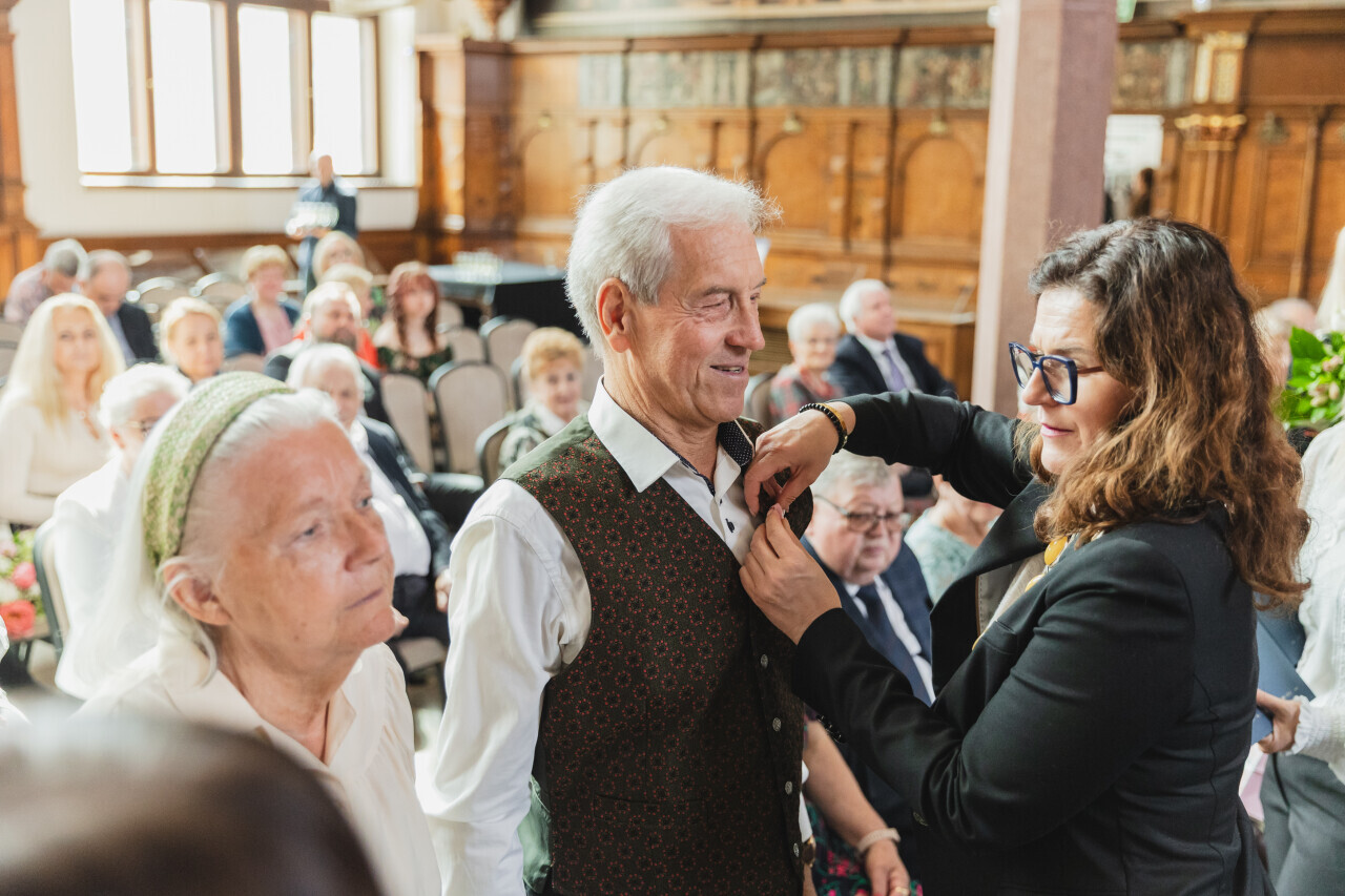 Gdańsk.Dwór Artusa. Jubileusz Par Małżeńskich - Złote Gody, podczas których Prezydent Gdańska Aleksandra Dulkiewicz wręczyła medale za długoletnie pożycie małżeńskie.