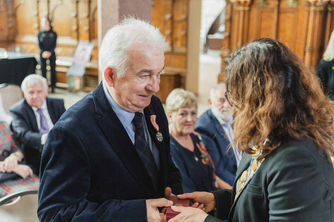 Gdańsk.Dwór Artusa. Jubileusz Par Małżeńskich - Złote Gody, podczas których Prezydent Gdańska Aleksandra Dulkiewicz wręczyła medale za długoletnie pożycie małżeńskie.