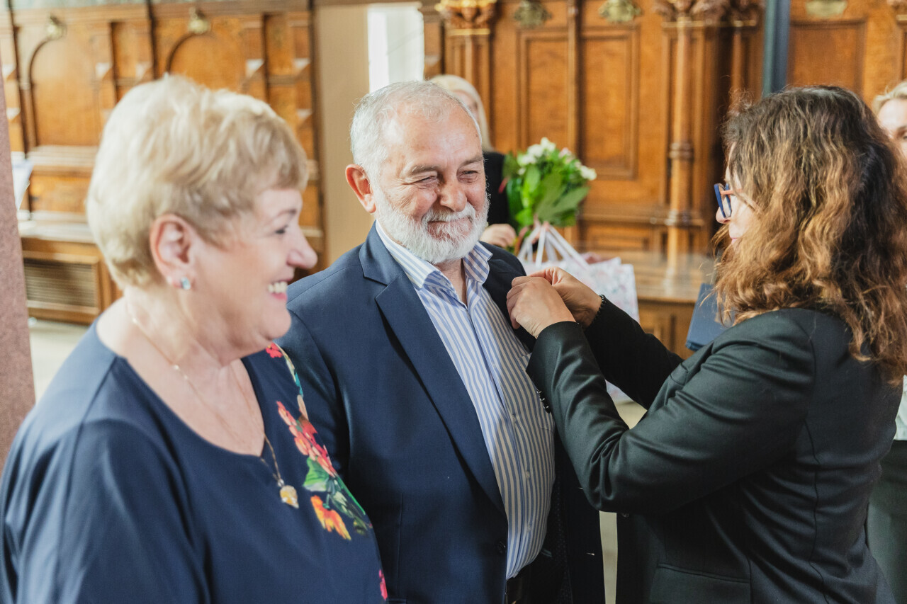 Gdańsk.Dwór Artusa. Jubileusz Par Małżeńskich - Złote Gody, podczas których Prezydent Gdańska Aleksandra Dulkiewicz wręczyła medale za długoletnie pożycie małżeńskie.