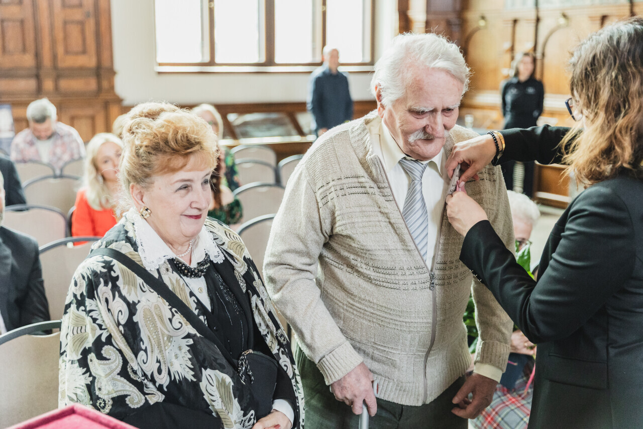 Gdańsk.Dwór Artusa. Jubileusz Par Małżeńskich - Złote Gody, podczas których Prezydent Gdańska Aleksandra Dulkiewicz wręczyła medale za długoletnie pożycie małżeńskie.