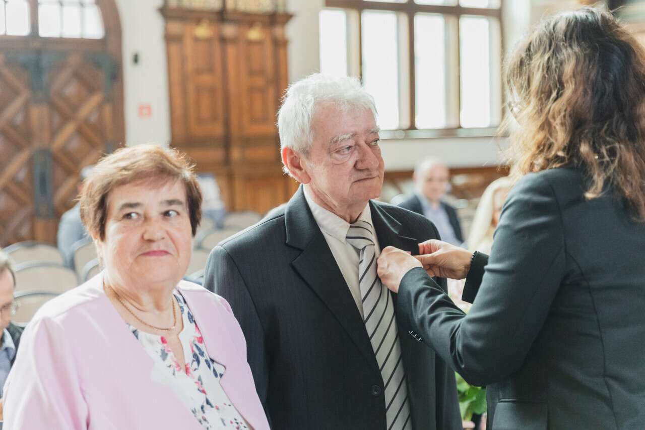 Gdańsk.Dwór Artusa. Jubileusz Par Małżeńskich - Złote Gody, podczas których Prezydent Gdańska Aleksandra Dulkiewicz wręczyła medale za długoletnie pożycie małżeńskie.