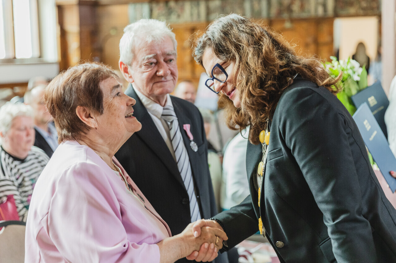 Gdańsk.Dwór Artusa. Jubileusz Par Małżeńskich - Złote Gody, podczas których Prezydent Gdańska Aleksandra Dulkiewicz wręczyła medale za długoletnie pożycie małżeńskie.
