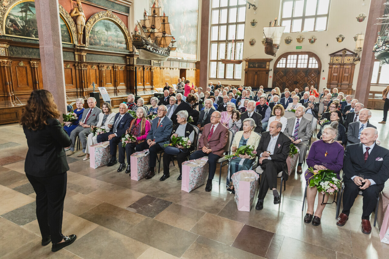 Gdańsk.Dwór Artusa. Jubileusz Par Małżeńskich - Złote Gody, podczas których Prezydent Gdańska Aleksandra Dulkiewicz wręczyła medale za długoletnie pożycie małżeńskie.