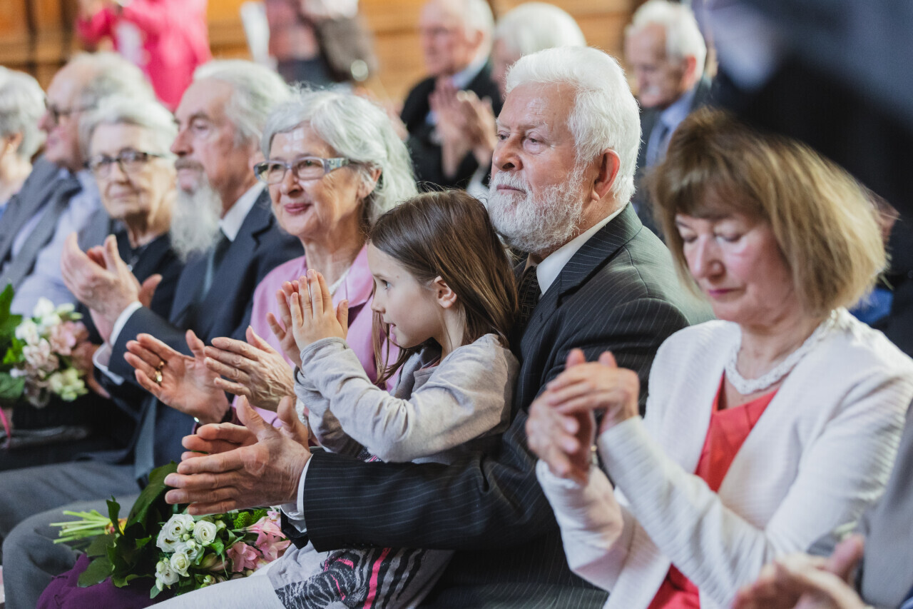 Gdańsk.Dwór Artusa. Jubileusz Par Małżeńskich - Złote Gody, podczas których Prezydent Gdańska Aleksandra Dulkiewicz wręczyła medale za długoletnie pożycie małżeńskie.