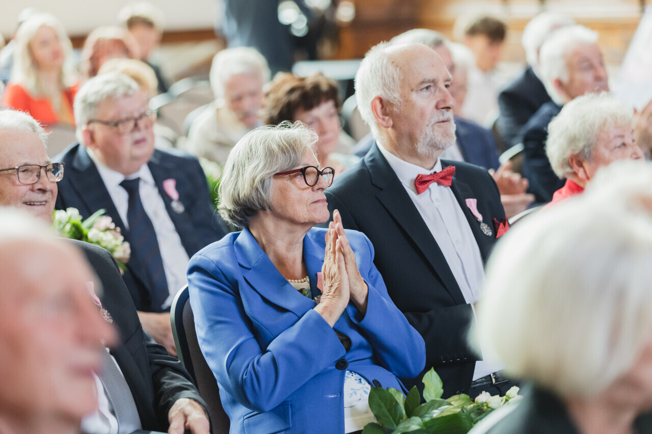 Gdańsk.Dwór Artusa. Jubileusz Par Małżeńskich - Złote Gody, podczas których Prezydent Gdańska Aleksandra Dulkiewicz wręczyła medale za długoletnie pożycie małżeńskie.