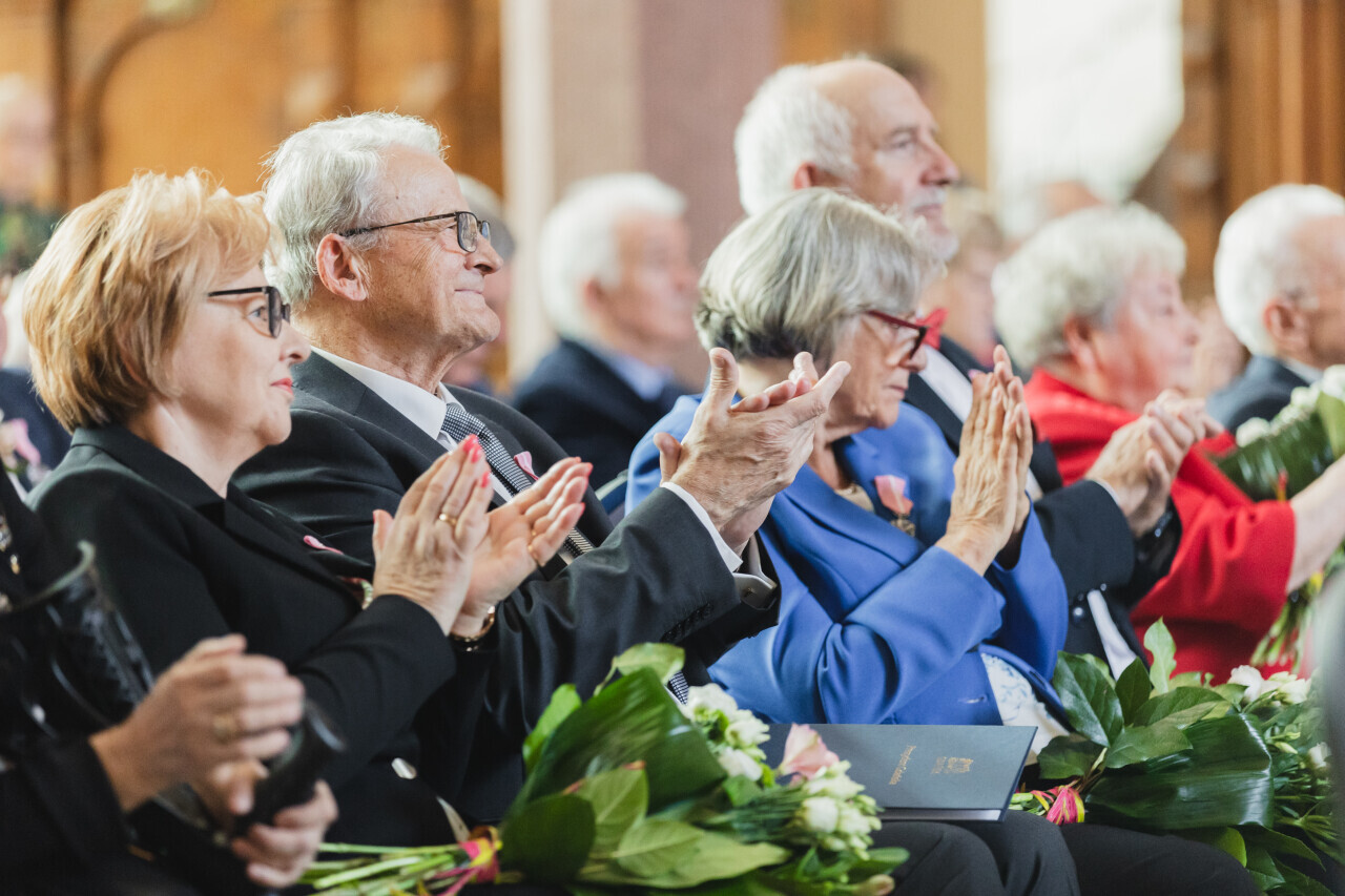 Gdańsk.Dwór Artusa. Jubileusz Par Małżeńskich - Złote Gody, podczas których Prezydent Gdańska Aleksandra Dulkiewicz wręczyła medale za długoletnie pożycie małżeńskie.