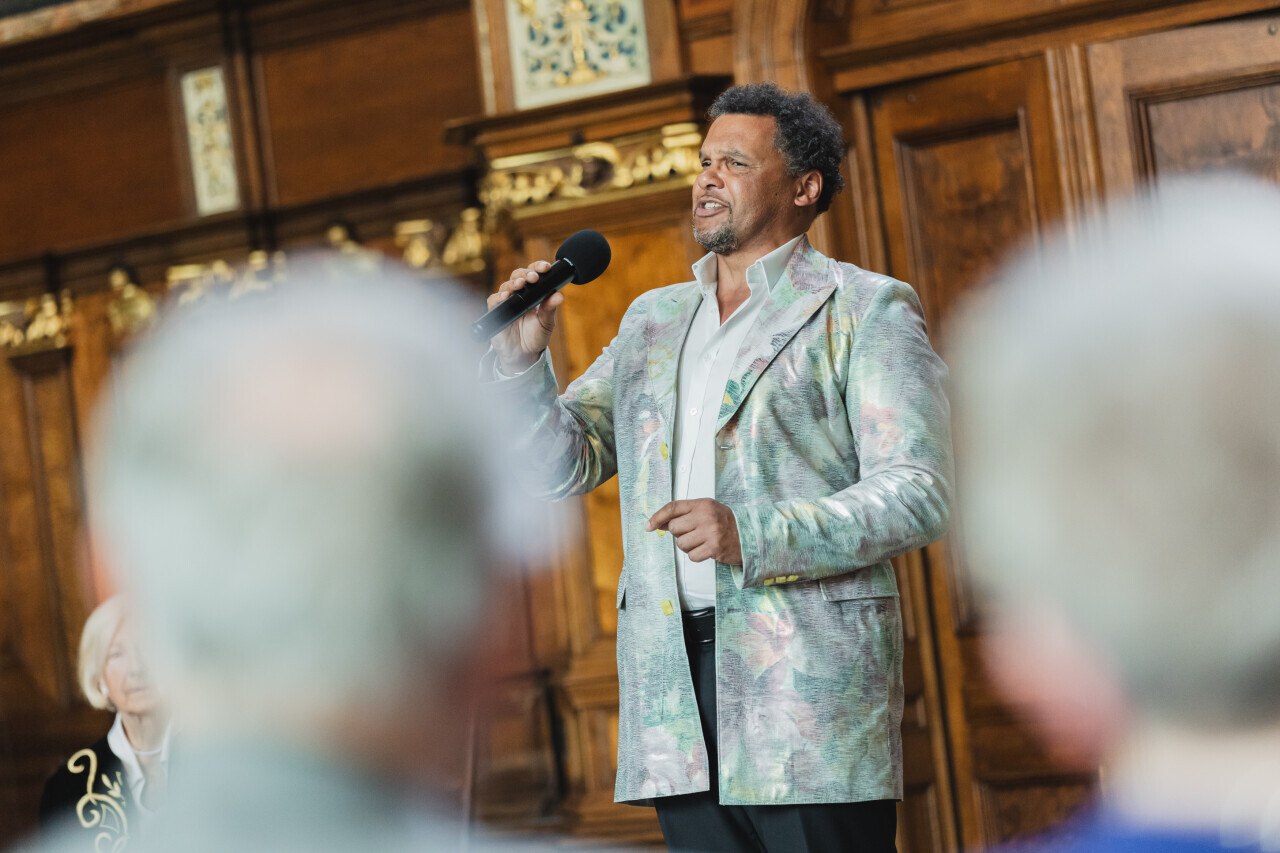 Gdańsk.Dwór Artusa. Jubileusz Par Małżeńskich - Złote Gody, podczas których Prezydent Gdańska Aleksandra Dulkiewicz wręczyła medale za długoletnie pożycie małżeńskie.