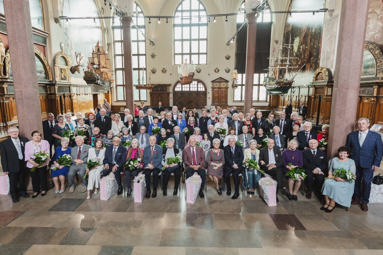 Gdańsk.Dwór Artusa. Jubileusz Par Małżeńskich - Złote Gody, podczas których Prezydent Gdańska Aleksandra Dulkiewicz wręczyła medale za długoletnie pożycie małżeńskie.