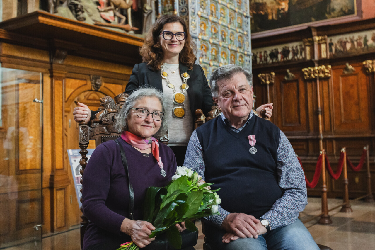 Gdańsk.Dwór Artusa. Jubileusz Par Małżeńskich - Złote Gody, podczas których Prezydent Gdańska Aleksandra Dulkiewicz wręczyła medale za długoletnie pożycie małżeńskie.