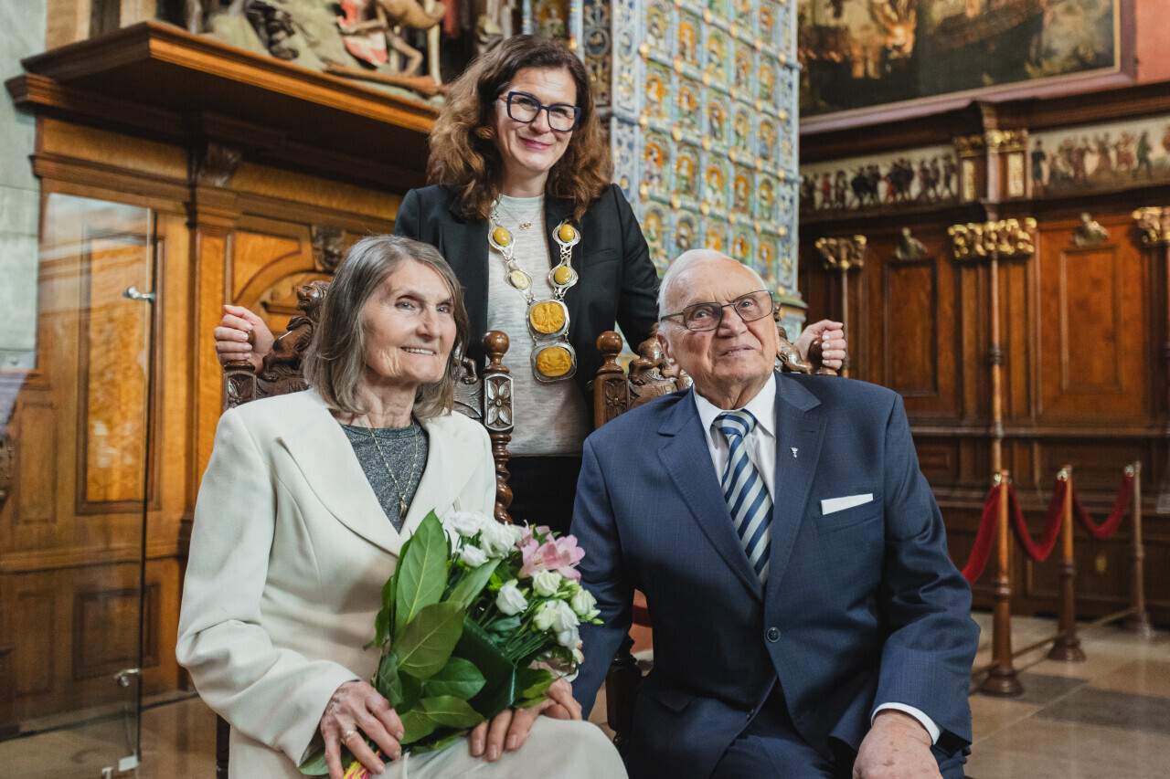 Gdańsk.Dwór Artusa. Jubileusz Par Małżeńskich - Złote Gody, podczas których Prezydent Gdańska Aleksandra Dulkiewicz wręczyła medale za długoletnie pożycie małżeńskie.