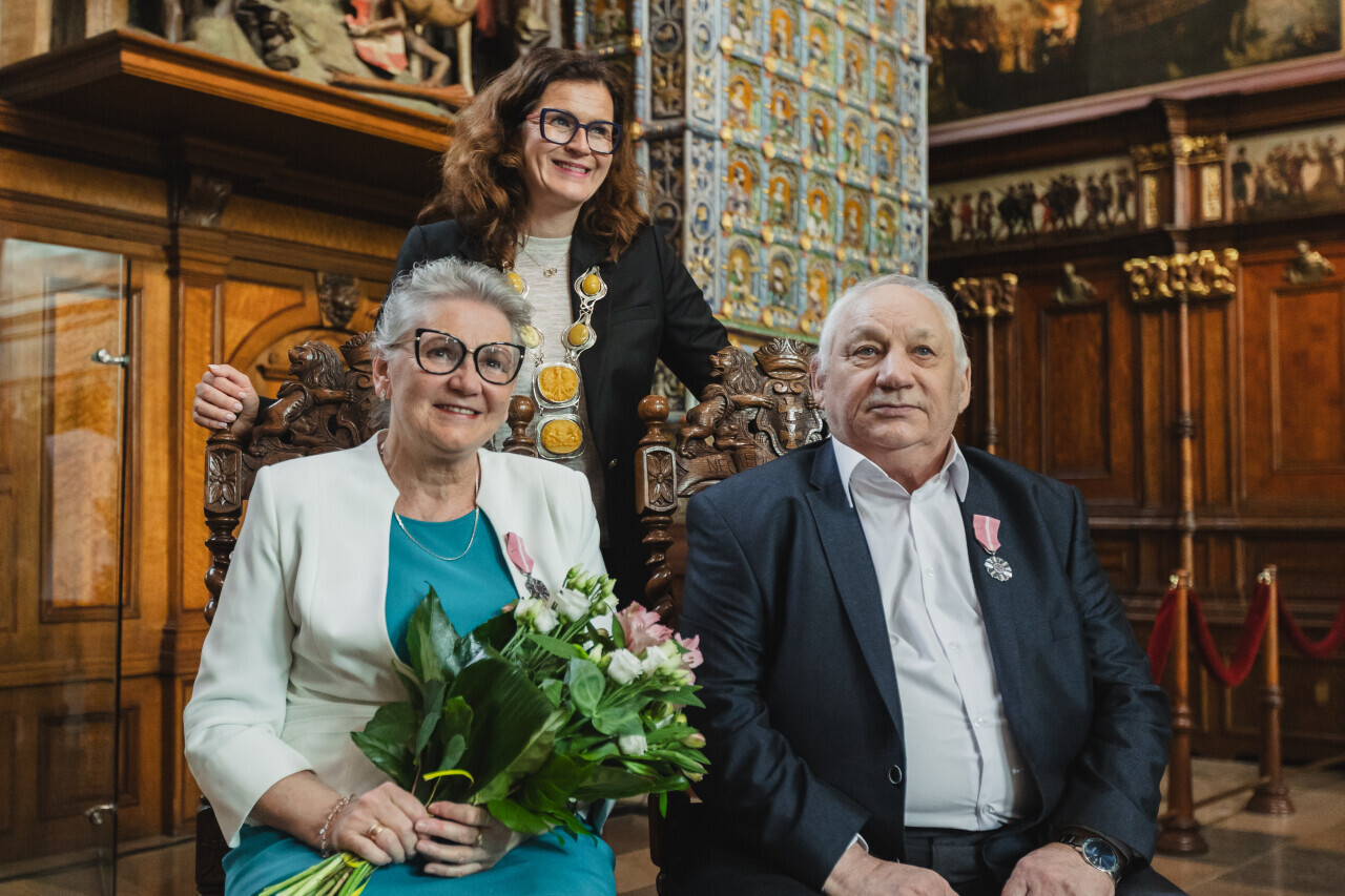 Gdańsk.Dwór Artusa. Jubileusz Par Małżeńskich - Złote Gody, podczas których Prezydent Gdańska Aleksandra Dulkiewicz wręczyła medale za długoletnie pożycie małżeńskie.