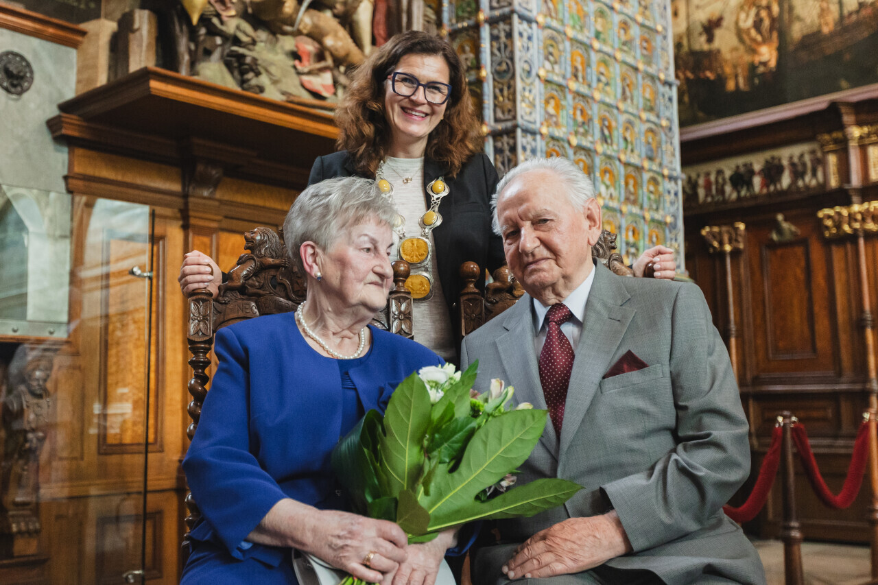 Gdańsk.Dwór Artusa. Jubileusz Par Małżeńskich - Złote Gody, podczas których Prezydent Gdańska Aleksandra Dulkiewicz wręczyła medale za długoletnie pożycie małżeńskie.