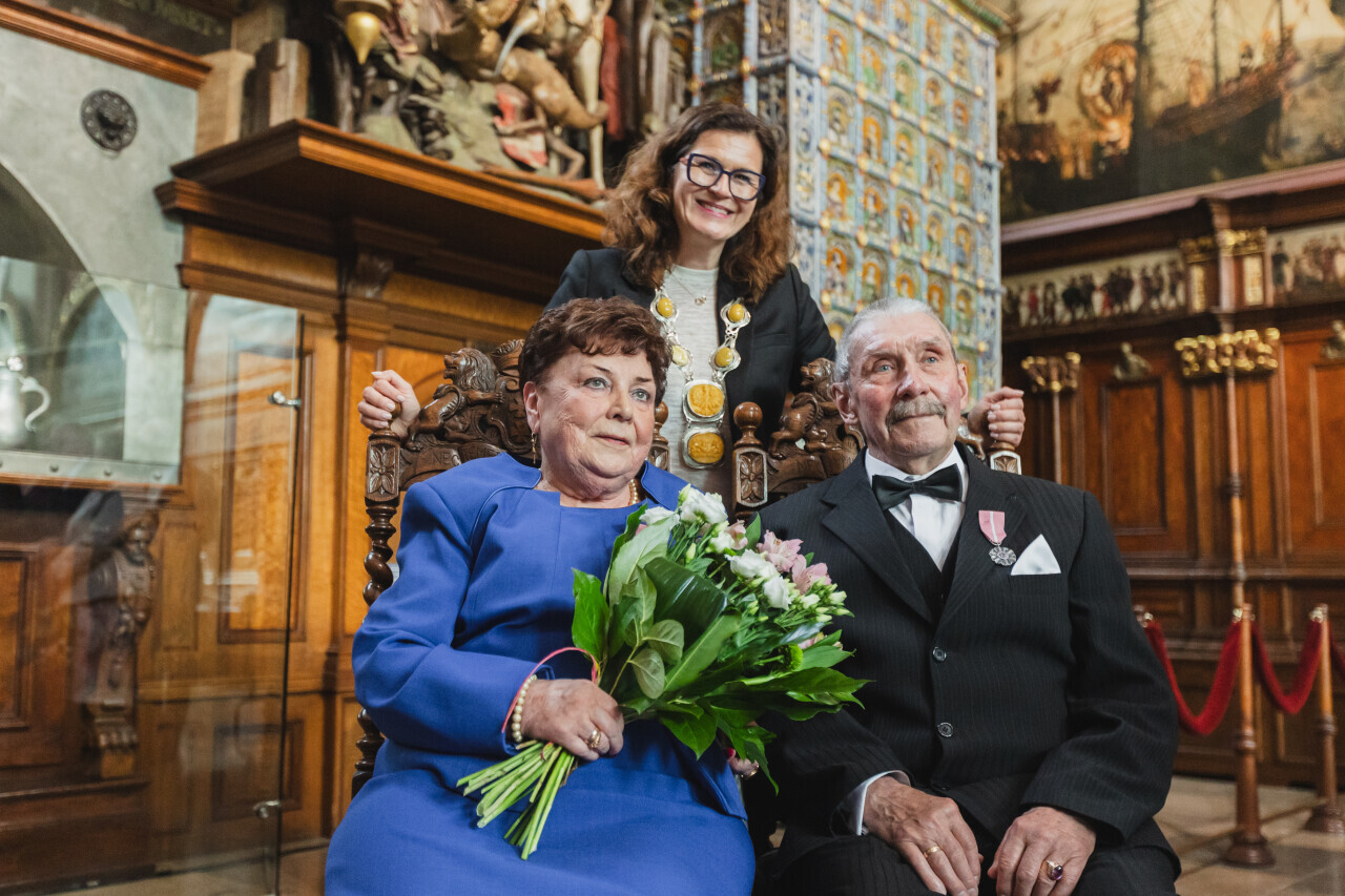 Gdańsk.Dwór Artusa. Jubileusz Par Małżeńskich - Złote Gody, podczas których Prezydent Gdańska Aleksandra Dulkiewicz wręczyła medale za długoletnie pożycie małżeńskie.