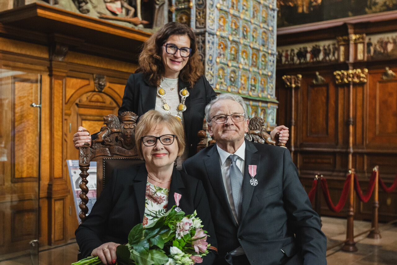 Gdańsk.Dwór Artusa. Jubileusz Par Małżeńskich - Złote Gody, podczas których Prezydent Gdańska Aleksandra Dulkiewicz wręczyła medale za długoletnie pożycie małżeńskie.