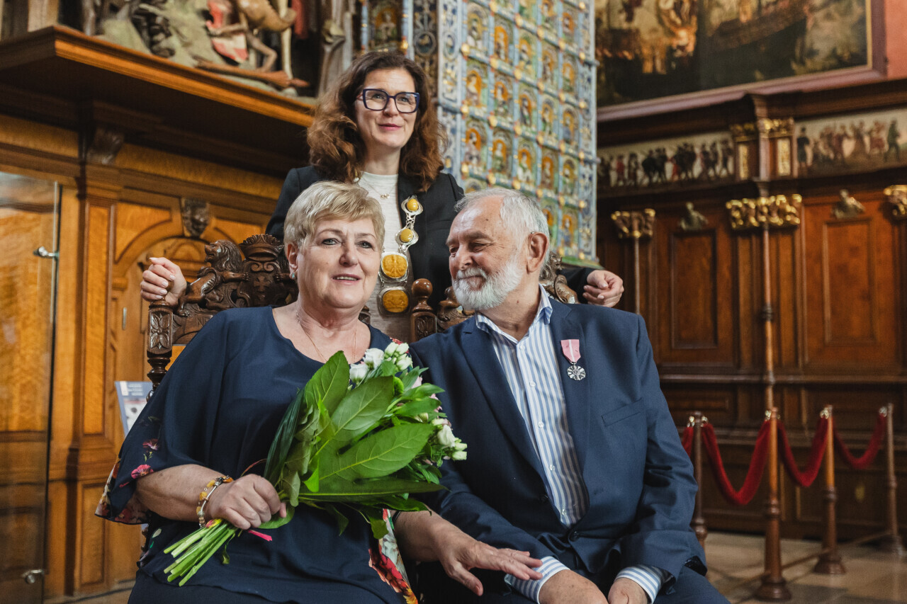 Gdańsk.Dwór Artusa. Jubileusz Par Małżeńskich - Złote Gody, podczas których Prezydent Gdańska Aleksandra Dulkiewicz wręczyła medale za długoletnie pożycie małżeńskie.
