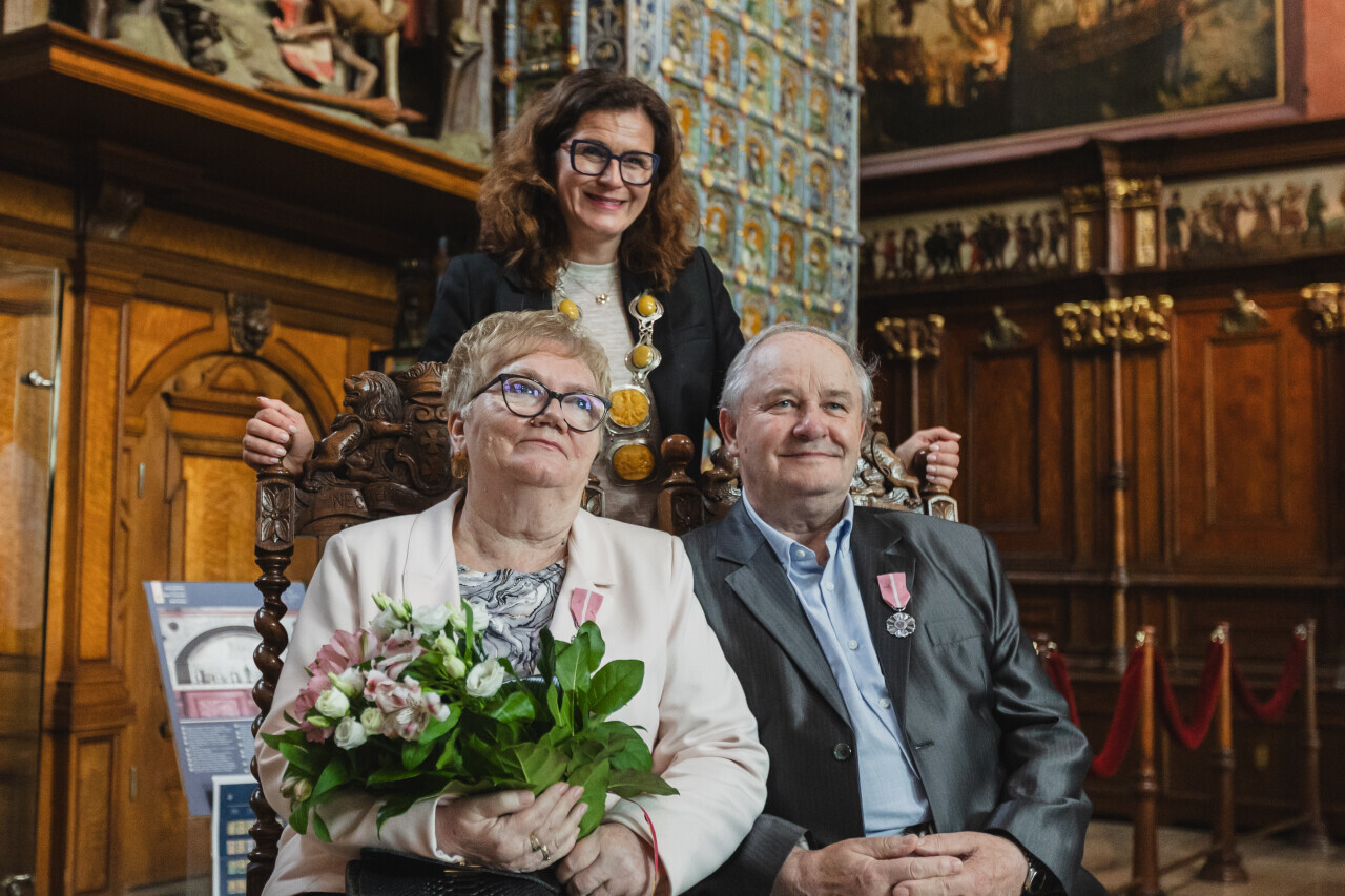 Gdańsk.Dwór Artusa. Jubileusz Par Małżeńskich - Złote Gody, podczas których Prezydent Gdańska Aleksandra Dulkiewicz wręczyła medale za długoletnie pożycie małżeńskie.