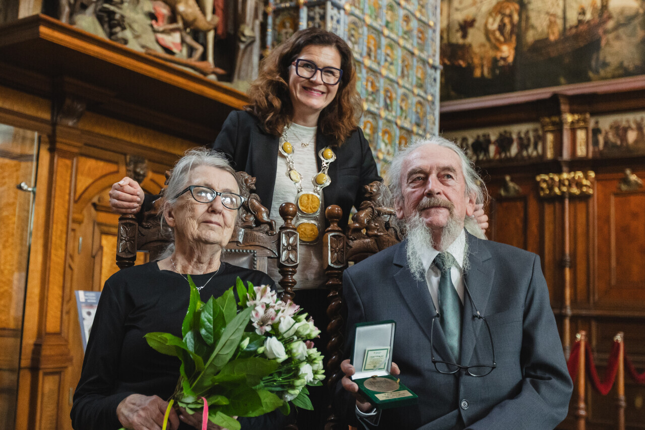 Gdańsk.Dwór Artusa. Jubileusz Par Małżeńskich - Złote Gody, podczas których Prezydent Gdańska Aleksandra Dulkiewicz wręczyła medale za długoletnie pożycie małżeńskie.