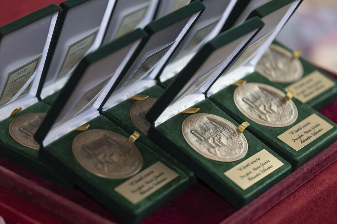 Gdańsk.Dwór Artusa. Jubileusz Par Małżeńskich - Złote Gody, podczas których Prezydent Gdańska Aleksandra Dulkiewicz wręczyła medale za długoletnie pożycie małżeńskie.