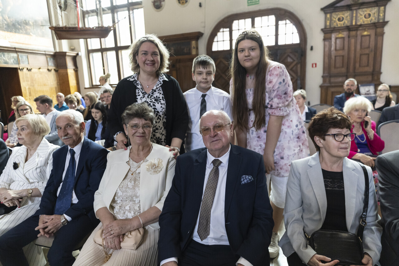 Gdańsk.Dwór Artusa. Jubileusz Par Małżeńskich - Złote Gody, podczas których Prezydent Gdańska Aleksandra Dulkiewicz wręczyła medale za długoletnie pożycie małżeńskie.