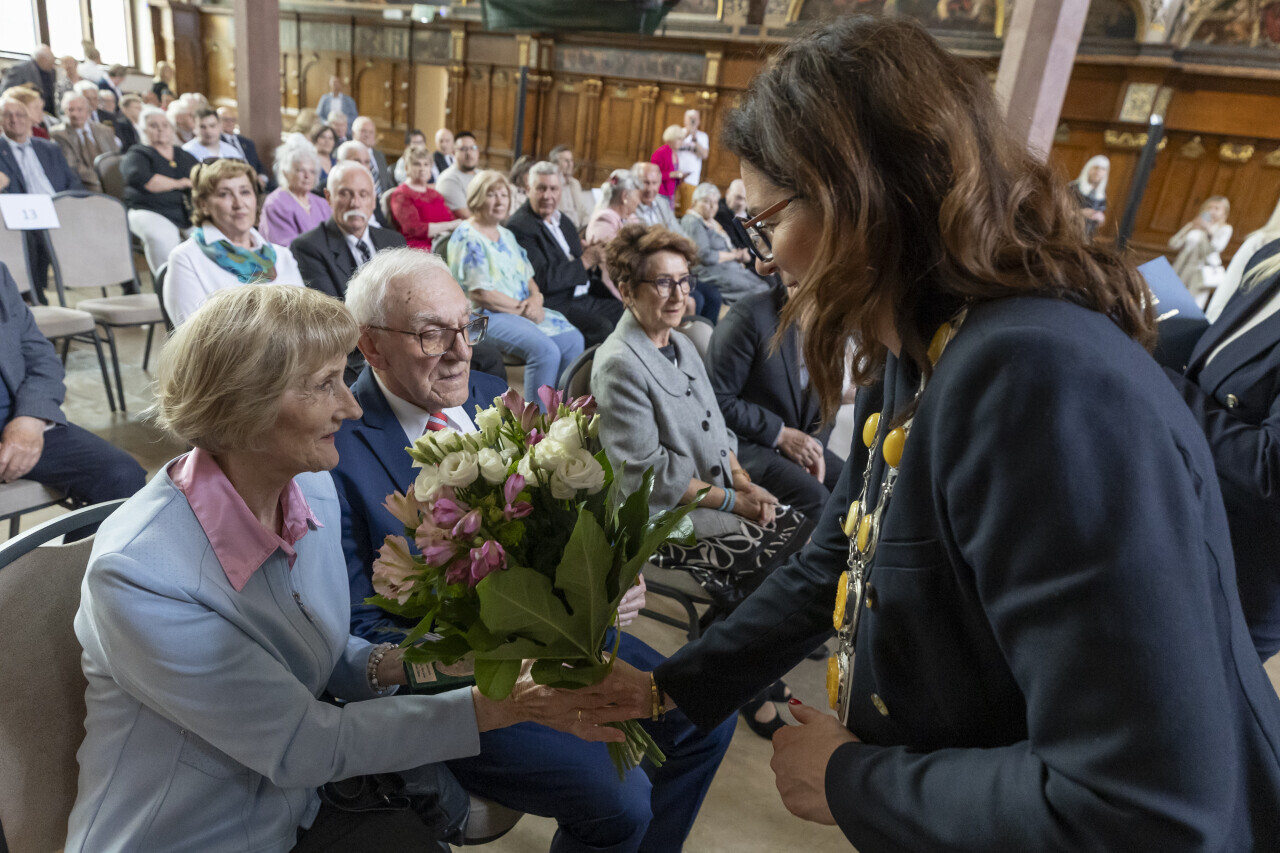 Gdańsk.Dwór Artusa. Jubileusz Par Małżeńskich - Złote Gody, podczas których Prezydent Gdańska Aleksandra Dulkiewicz wręczyła medale za długoletnie pożycie małżeńskie.