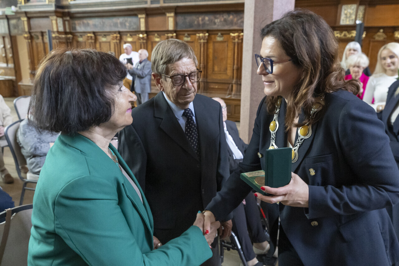 Gdańsk.Dwór Artusa. Jubileusz Par Małżeńskich - Złote Gody, podczas których Prezydent Gdańska Aleksandra Dulkiewicz wręczyła medale za długoletnie pożycie małżeńskie.