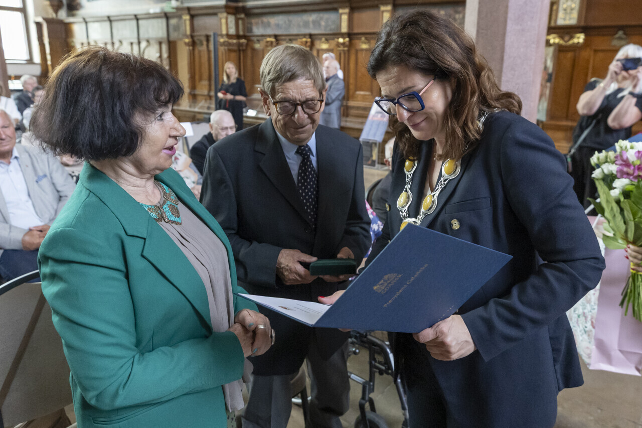 Gdańsk.Dwór Artusa. Jubileusz Par Małżeńskich - Złote Gody, podczas których Prezydent Gdańska Aleksandra Dulkiewicz wręczyła medale za długoletnie pożycie małżeńskie.