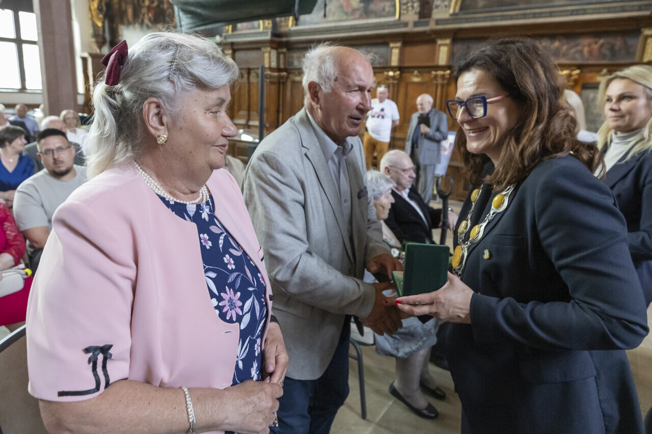 Gdańsk.Dwór Artusa. Jubileusz Par Małżeńskich - Złote Gody, podczas których Prezydent Gdańska Aleksandra Dulkiewicz wręczyła medale za długoletnie pożycie małżeńskie.