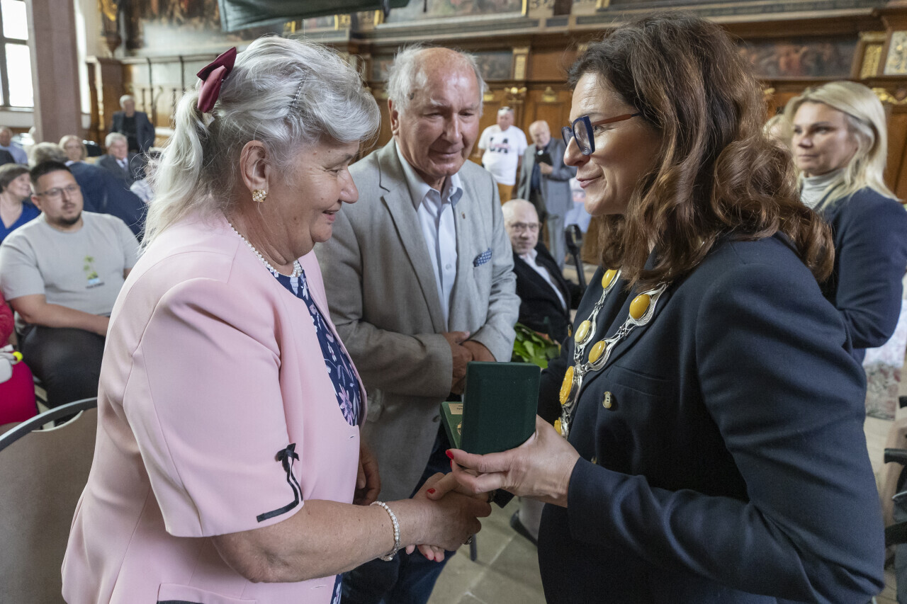 Gdańsk.Dwór Artusa. Jubileusz Par Małżeńskich - Złote Gody, podczas których Prezydent Gdańska Aleksandra Dulkiewicz wręczyła medale za długoletnie pożycie małżeńskie.