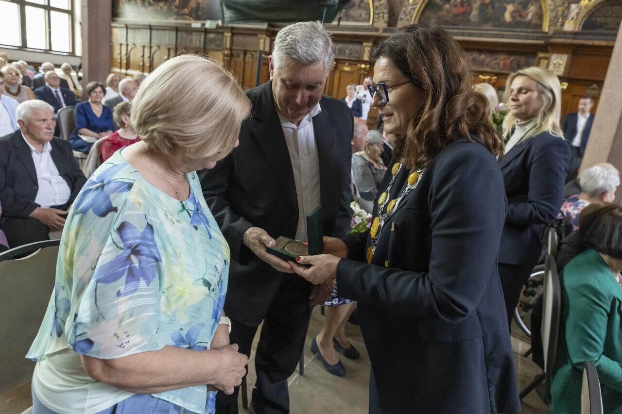Gdańsk.Dwór Artusa. Jubileusz Par Małżeńskich - Złote Gody, podczas których Prezydent Gdańska Aleksandra Dulkiewicz wręczyła medale za długoletnie pożycie małżeńskie.