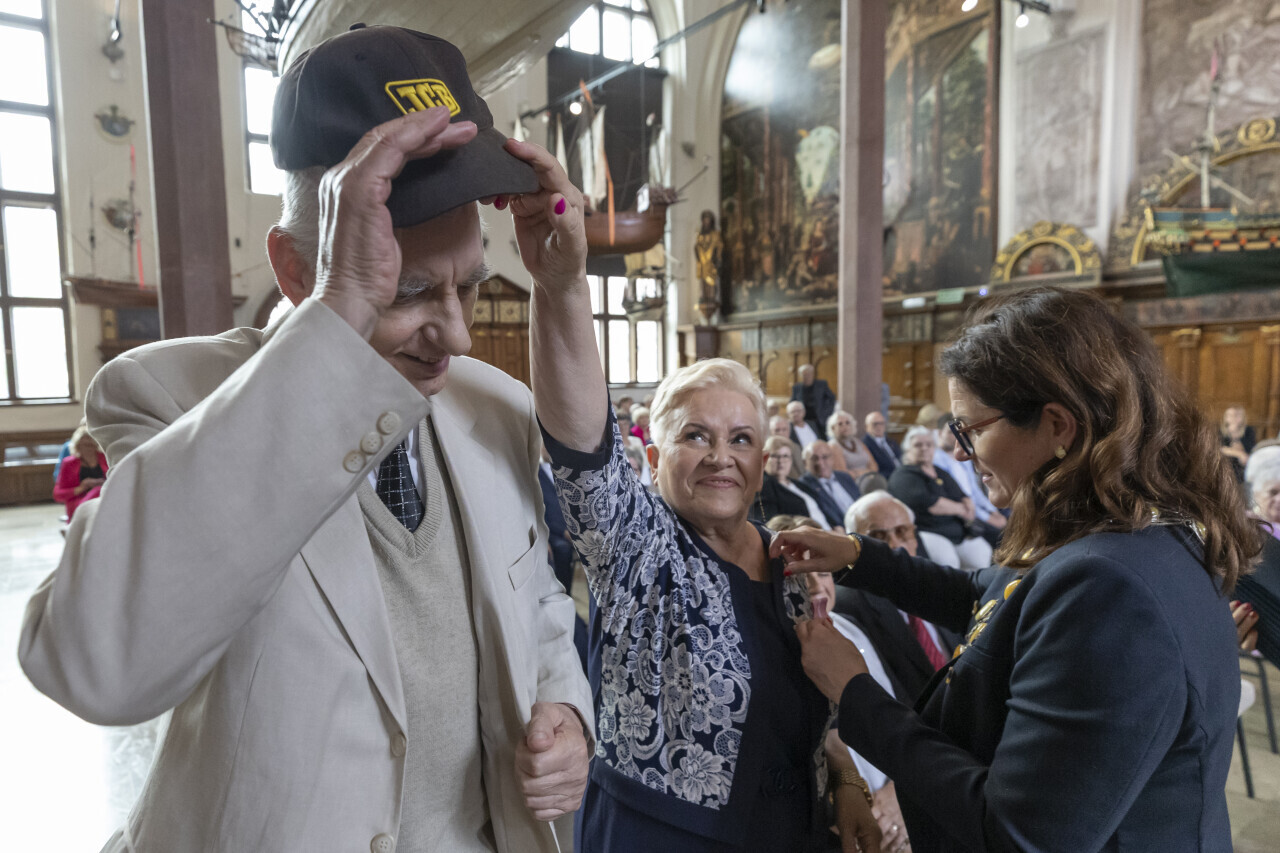 Gdańsk.Dwór Artusa. Jubileusz Par Małżeńskich - Złote Gody, podczas których Prezydent Gdańska Aleksandra Dulkiewicz wręczyła medale za długoletnie pożycie małżeńskie.