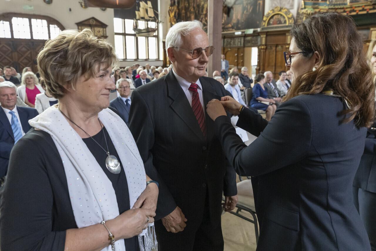 Gdańsk.Dwór Artusa. Jubileusz Par Małżeńskich - Złote Gody, podczas których Prezydent Gdańska Aleksandra Dulkiewicz wręczyła medale za długoletnie pożycie małżeńskie.