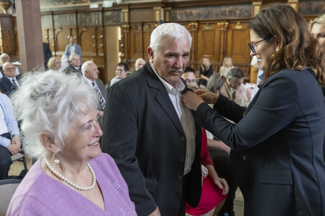 Gdańsk.Dwór Artusa. Jubileusz Par Małżeńskich - Złote Gody, podczas których Prezydent Gdańska Aleksandra Dulkiewicz wręczyła medale za długoletnie pożycie małżeńskie.