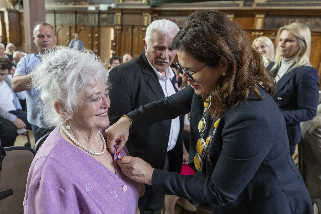 Gdańsk.Dwór Artusa. Jubileusz Par Małżeńskich - Złote Gody, podczas których Prezydent Gdańska Aleksandra Dulkiewicz wręczyła medale za długoletnie pożycie małżeńskie.