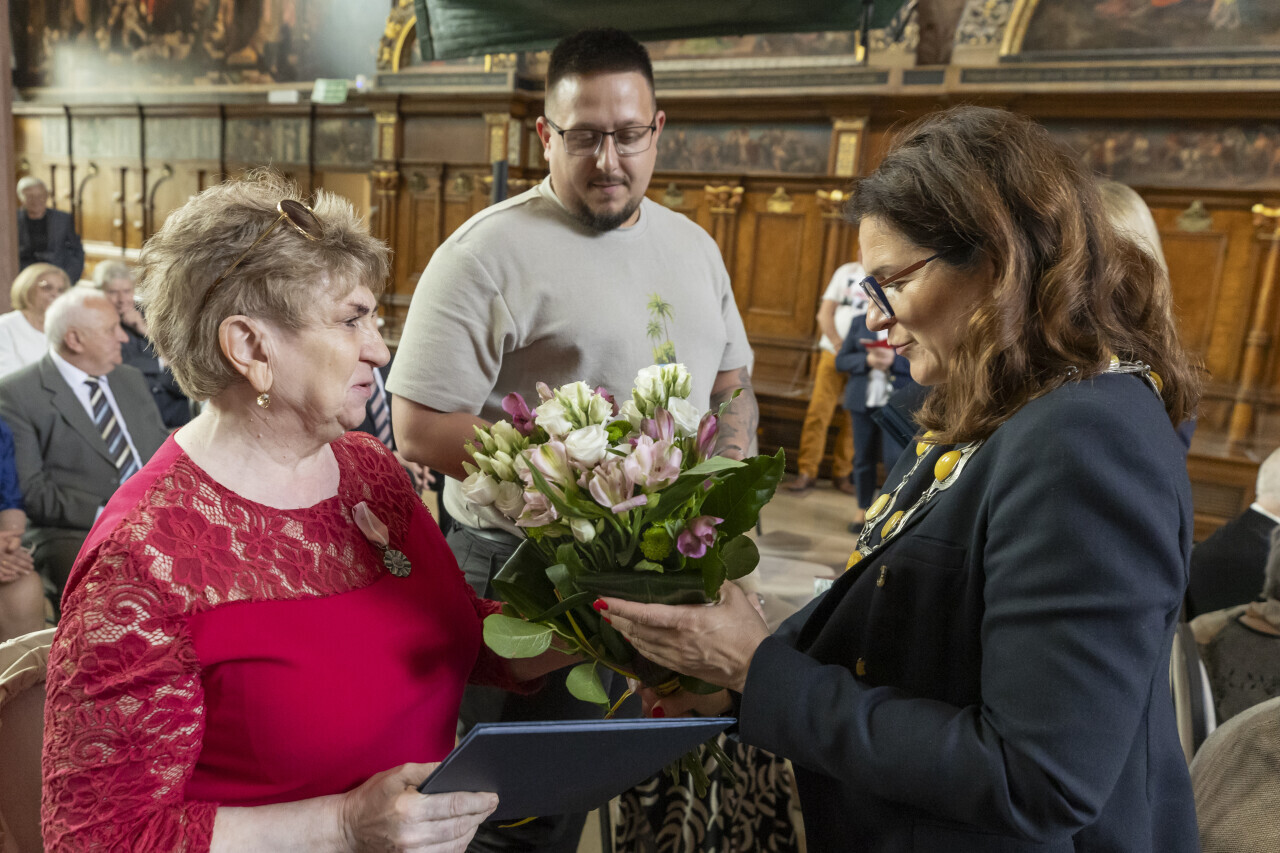 Gdańsk.Dwór Artusa. Jubileusz Par Małżeńskich - Złote Gody, podczas których Prezydent Gdańska Aleksandra Dulkiewicz wręczyła medale za długoletnie pożycie małżeńskie.