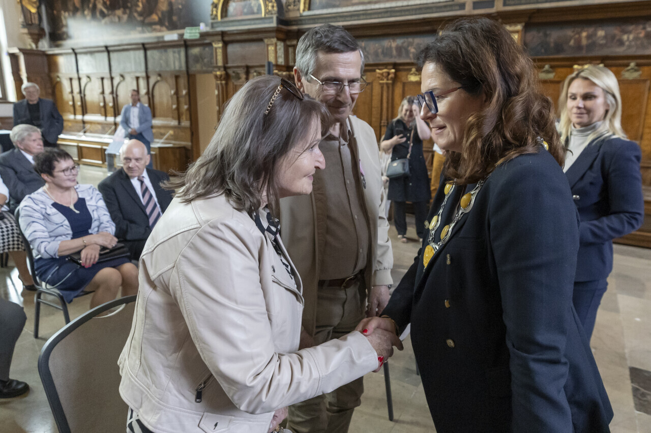 Gdańsk.Dwór Artusa. Jubileusz Par Małżeńskich - Złote Gody, podczas których Prezydent Gdańska Aleksandra Dulkiewicz wręczyła medale za długoletnie pożycie małżeńskie.
