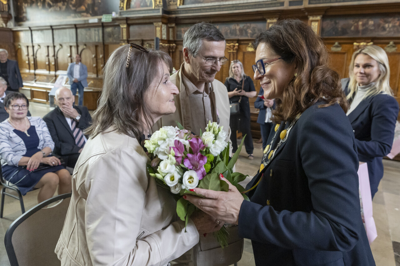 Gdańsk.Dwór Artusa. Jubileusz Par Małżeńskich - Złote Gody, podczas których Prezydent Gdańska Aleksandra Dulkiewicz wręczyła medale za długoletnie pożycie małżeńskie.
