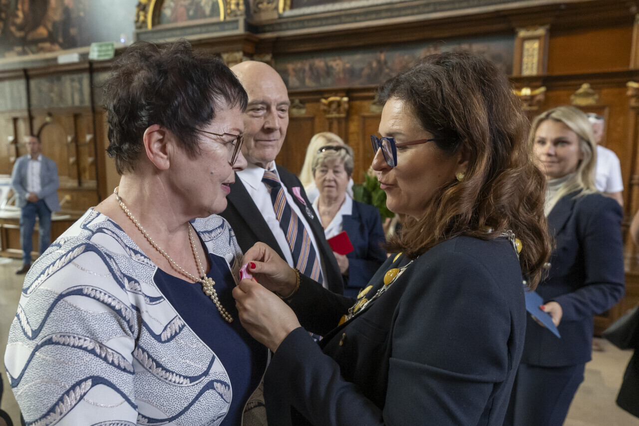 Gdańsk.Dwór Artusa. Jubileusz Par Małżeńskich - Złote Gody, podczas których Prezydent Gdańska Aleksandra Dulkiewicz wręczyła medale za długoletnie pożycie małżeńskie.