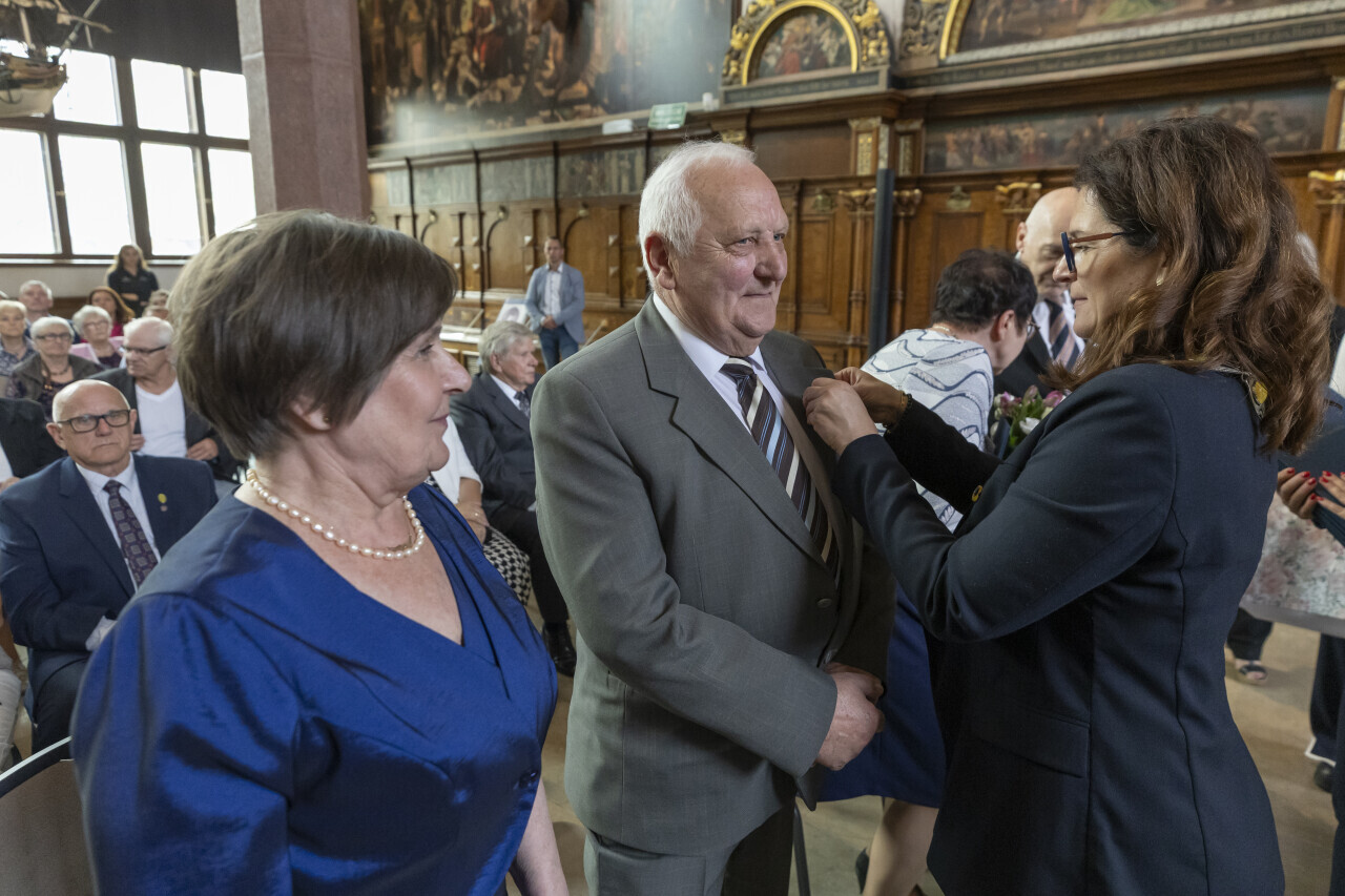 Gdańsk.Dwór Artusa. Jubileusz Par Małżeńskich - Złote Gody, podczas których Prezydent Gdańska Aleksandra Dulkiewicz wręczyła medale za długoletnie pożycie małżeńskie.