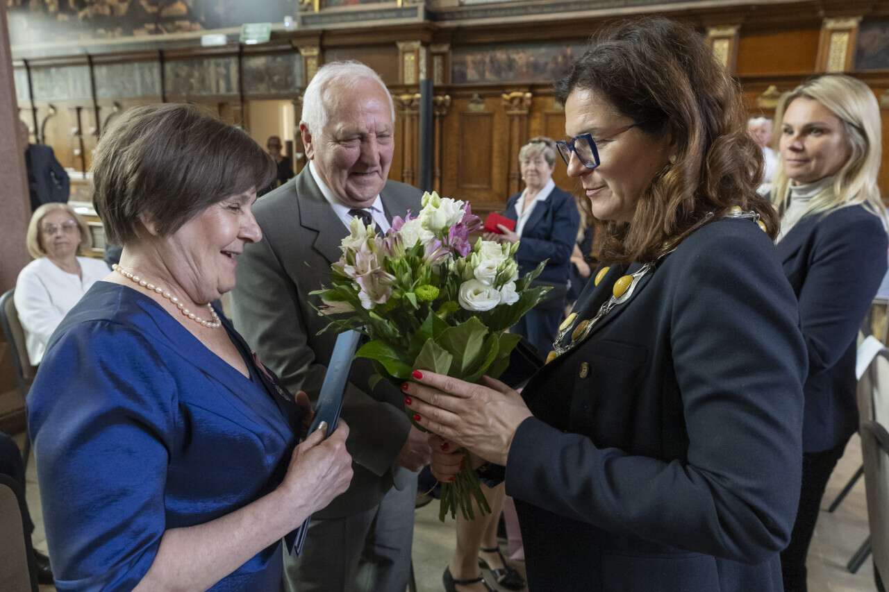Gdańsk.Dwór Artusa. Jubileusz Par Małżeńskich - Złote Gody, podczas których Prezydent Gdańska Aleksandra Dulkiewicz wręczyła medale za długoletnie pożycie małżeńskie.