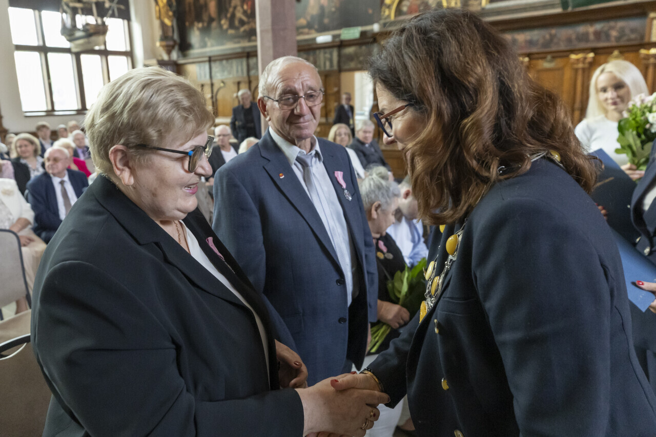 Gdańsk.Dwór Artusa. Jubileusz Par Małżeńskich - Złote Gody, podczas których Prezydent Gdańska Aleksandra Dulkiewicz wręczyła medale za długoletnie pożycie małżeńskie.