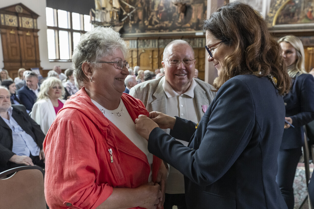 Gdańsk.Dwór Artusa. Jubileusz Par Małżeńskich - Złote Gody, podczas których Prezydent Gdańska Aleksandra Dulkiewicz wręczyła medale za długoletnie pożycie małżeńskie.